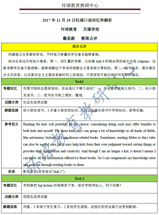 环球教育教研中心为大家整理了2017年11月18日托福考题全部内容:听、说、读、写完整回忆和解析,希望能帮大家更上一层楼。